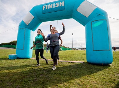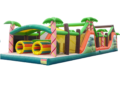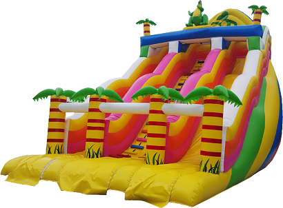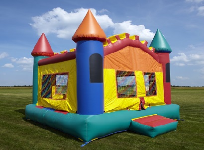 Stock photo of a children’s bouncy castle inflatable jumper playground in a grass field with a blue sky.