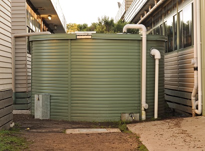 Large green rainwater collection tank with pipes coming from roof used in Australia
