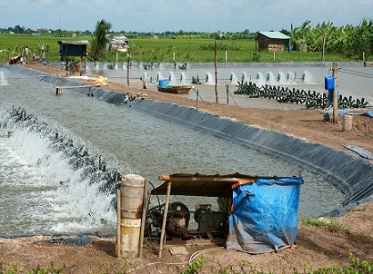 Shrimp hatching pond under cloudy sky at Mekong Delta, Vietnam, engine rotate to make O2 for shrimp, shrimp lake among Viet Nam countryside